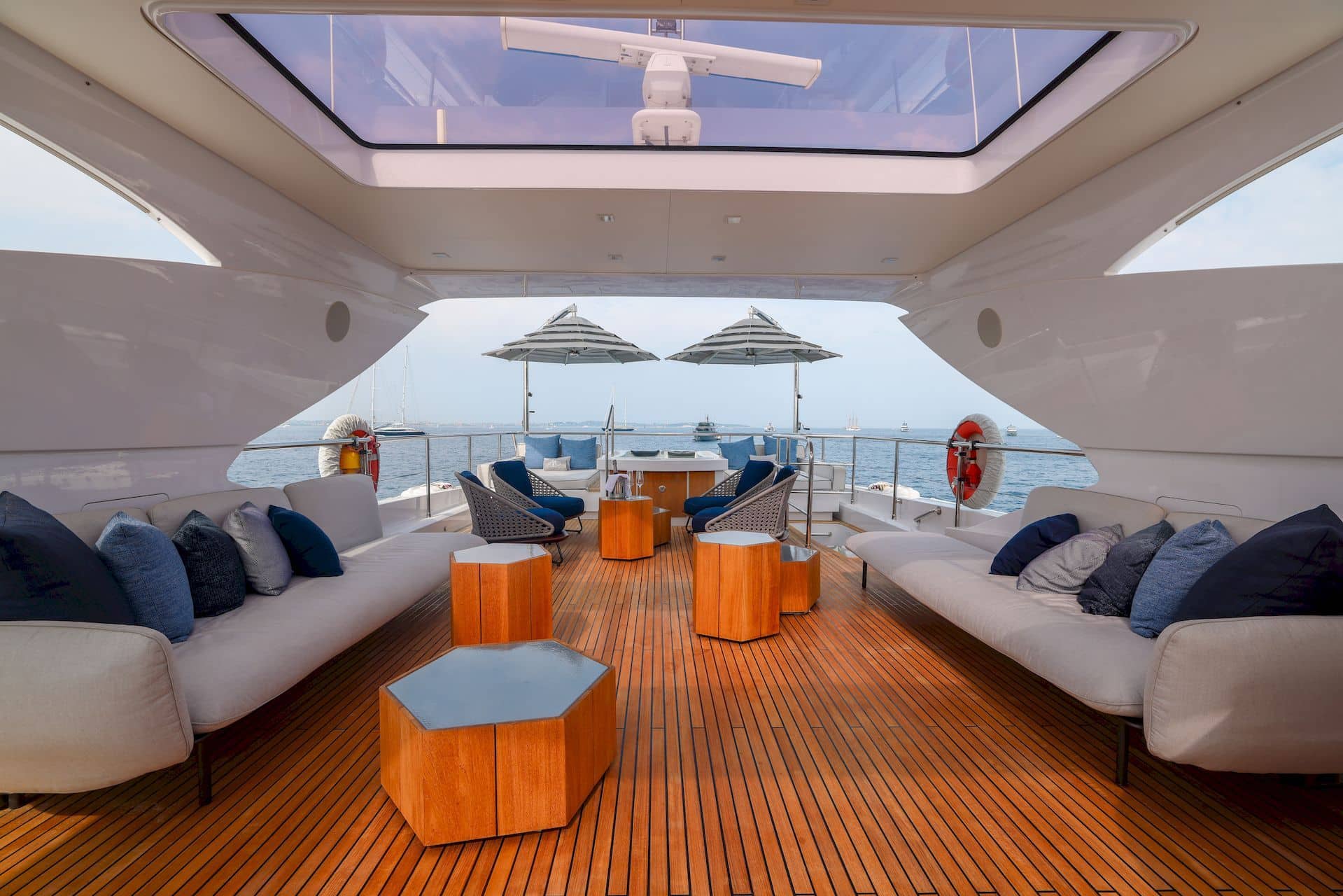 L’extérieur du yacht à moteur Millesime offre un panel d’équipements de luxe pour une escapade relaxante sur la mer Méditerranée. Son pont inférieur dispose de bains de soleil au niveau de sa poupe et de deux tables qui peuvent être réunies pour les grandes familles, idéal pour un petit-déjeuner rempli de vitamines au bord de l’eau. Le pont supérieur est l’espace dédié au divertissement et à l’amusement. Imaginez-vous dans le jacuzzi pendant que votre hôtesse vous prépare un cocktail maison derrière le bar, vous ne rêvez pas c’est possible! L’aménagement du pont supérieur a été soigneusement pensé pour regrouper toutes les installations que tout amateur de yacht souhaiterait avoir à proximité – un jacuzzi à l’arrière, un coin salon avec des canapés confortables et des tables basses tendance idéales pour une happy hour, un bar entièrement équipé et même une plancha électrique pour émerveiller vos papilles – Millesime a tout à bord et vaut la peine d’être exploré !